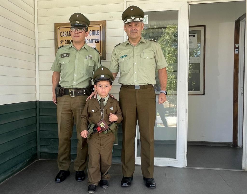 El niño, desde temprana edad mostró gran admiración por el trabajo desarrollando por Carabineros, manifestando a sus familiares el deseo de vestir el verde uniforme, el que fue solicitado al Viejo Pascuero, quien cumplió su anhelo la pasada noche buena, motivo por el cual, el Coronel Muñoz llegó hasta su domicilió y lo asombró asiéndolo parte de un patrullaje por el sector y destacamento policial.