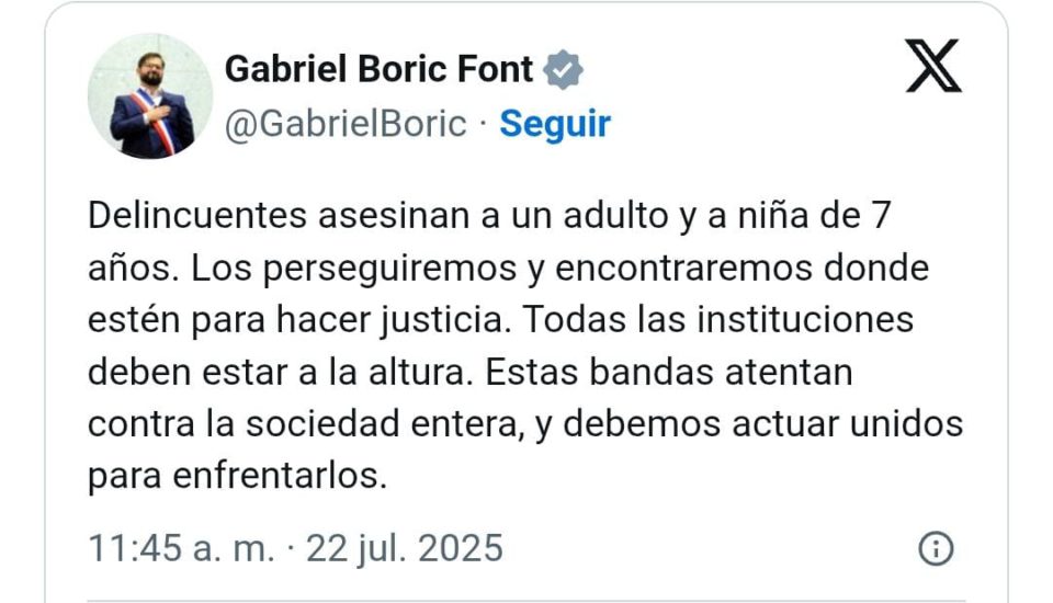 El presidente Gabriel Boric utilizó su cuenta en X para condenar el doble homicidio ocurrido este martes en La Granja, donde fueron asesinados un hombre y su hija de 7 años.