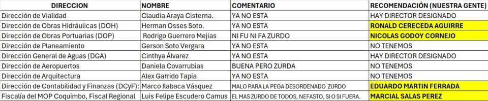 Una fuerte controversia surgió en la región de Coquimbo tras la difusión de una supuesta planilla de Excel en la que se evaluaría a funcionarios y exfuncionarios del Ministerio de Obras Públicas (MOP) según su ideología política. El documento, que habría sido enviado por error a través de un correo masivo, incluiría columnas como “Dirección”, “Nombre”, “Comentario” y “Recomendación”, generando cuestionamientos por priorizar supuestos criterios políticos por sobre el desempeño laboral.