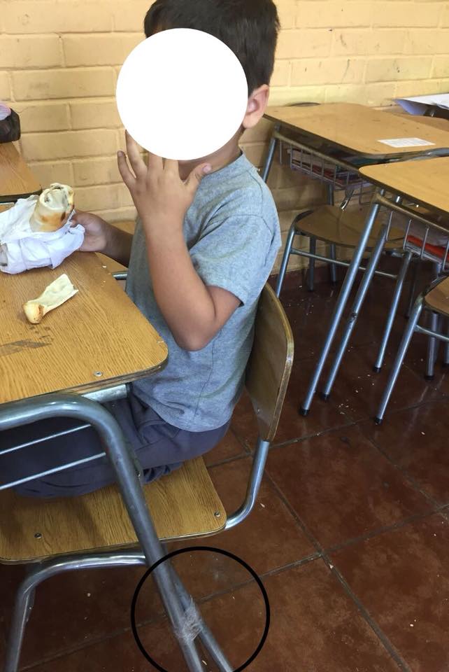 «Hoy miércoles 29 de noviembre de 2017, fui al colegio Piamarta donde asiste mi hijo, a darle su almuerzo como todos los días. Al llegar me encuentro con una apoderada que me pregunta si es que había visto a mi hijo. Entro y lo veo con su mesa y silla amarrada con Scotch, le pregunté inmediatamente por qué estaba amarrado y me dijo que la profesora se lo había puesto para que no se parara».