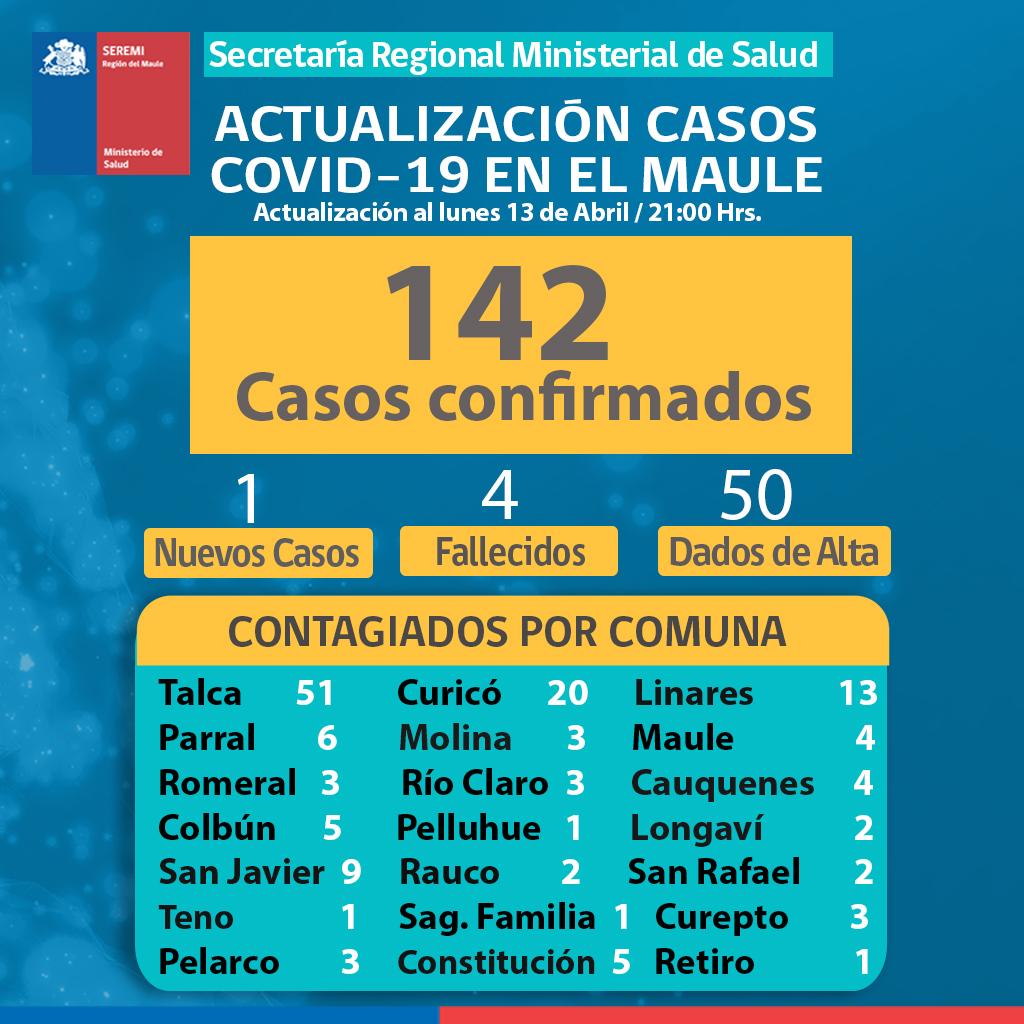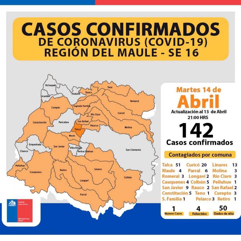 Además, en el Maule se han dado de alta 50 pacientes de Coronavirus, hay 19 casos hospitalizados y cuatro fallecidos.