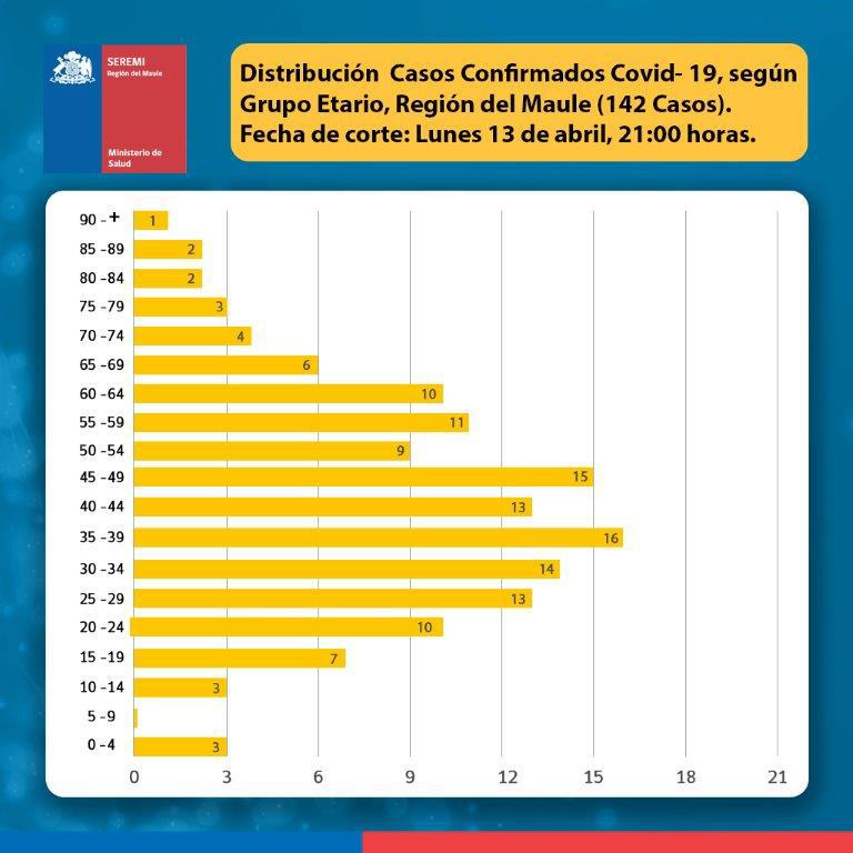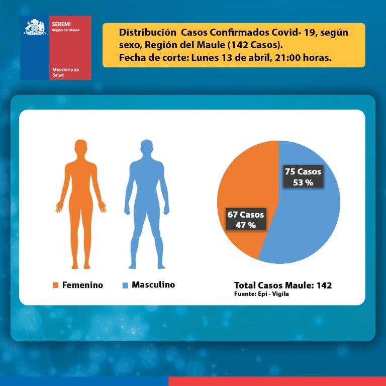 De estos 142 casos en el Maule; 51 son de Talca, veinte de Curicó, tres de Río Claro, trece de Linares, dos de Longaví, seis de Parral, cuatro de Maule, tres de Romeral, cuatro de Cauquenes, uno de Pelluhue, cinco de Colbún, tres de Molina, cinco de Constitución, nueve de San Javier, dos de Rauco, dos de San Rafael, uno de Sagrada Familia, tres de Curepto, uno de Teno, tres de Pelarco y uno de Retiro.