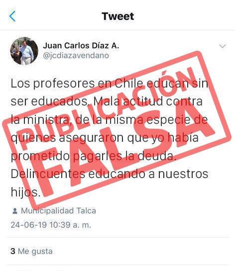 Según se percibe en la imagen del tuit, se puede ver la fecha y hora de su publicación, burdo montaje que queda en evidencia si se ingresa en la cuenta verdadera de Twitter de la máxima autoridad comunal, donde figura la misma fecha, hora, me gusta y etiqueta de la Municipalidad de Talca pero con la publicación que efectivamente se realizó, con un saludo por la celebración del “Día Nacional de los Pueblos Indígenas”.