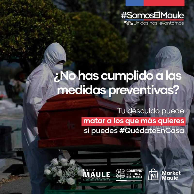 La campaña “Tu descuido puede matar a los que más quieres, si puedes quédate en casa” busca a través de gráficas que los maulinos tomen conciencia de la situación que vive el país y la región, haciendo un llamado de atención a las personas irresponsables que no cumplen con las medidas exigidas por las autoridades sanitarias, como aquellos que no ocupan las mascarillas en lugares públicos, a quienes no cumplen las medidas higiénicas ni el distanciamiento social, a los que se pasean por el centro realizando compras innecesarias, para los que se reúnen en fiestas con amigos y principalmente a las personas contagiadas que no cumplen con la cuarentena, poniendo en riesgo a la comunidad.