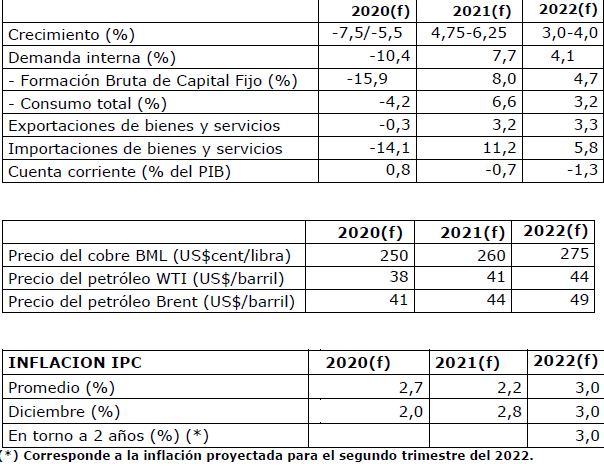 En su reporte, habló de una contracción «de entre -5,5% y -7,5%, la mayor en 35 años». Agregó que «parte importante de esta contracción ya ha ocurrido, tomando en cuenta las caídas de actividad en marzo y abril, previéndose que la de mayo y junio habrán sido superiores a esta última debido a la ampliación de las cuarentenas en la región metropolitana y a las principales zonas urbanas de la región de Valparaíso».