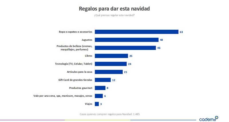 Asimismo, el estudio consultó sobre cuáles son los regalos que piensan dar. Un 63% dijo ropa, zapatos o accesorios; 48% se inclinó por juguetes y un 46% por productos de belleza.
