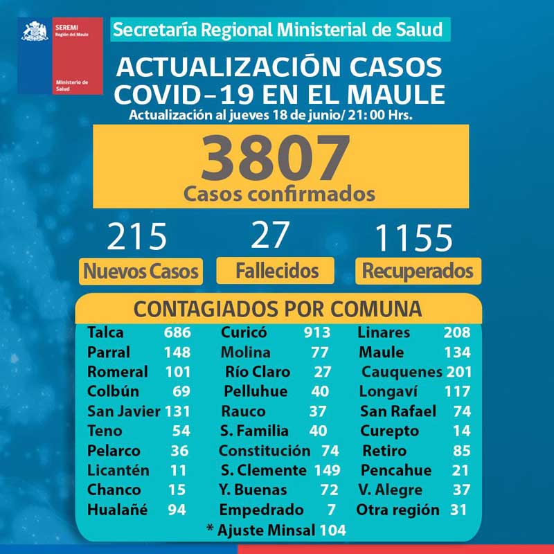 Tras los resultados entregados por la autoridad sanitaria regional, se confirmaron 3 mil 807 casos de Covid-19 en el Maule, luego de reportar 215 nuevos casos para el informe del 19 de junio, con cierre a las 21 horas del jueves 18 de junio.