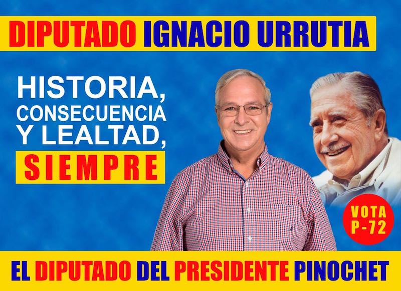 La foto de campaña dice frases como, “Diputado Ignacio Urrutia, el diputado del Presidente Pinochet”, “Historia, consecuencia y lealtad, siempre”. Frases que son usadas en la fotografía y donde el diputado del Maule Sur se ve franqueado por la imagen de un sonriente Augusto Pinochet.