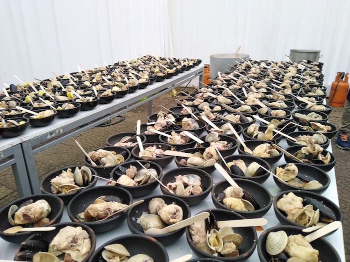 250 kilos de mariscos, 70 kilos de pollo, 30 kilos de longaniza y de pollo, además de 15 litros de vino blanco fueron los insumos que se utilizaron este año 2020 en la preparación del pollo a la marinera que se realizó este domingo 23 de febrero en Plaza de Armas de Constitución, y que contó con la asistencia masiva de público para degustar las 500 raciones que se regalaron en la ocasión, servidas en un librillo de greda y cuchara de madera para hacer de esta actividad sustentable con el cuidado del medio ambiente.