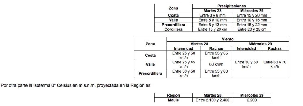 En consideración a estos antecedentes, la Dirección Regional de ONEMI Maule declara Alerta Temprana Preventiva Regional por sistema frontal, vigente a partir de hoy y hasta que las condiciones meteorológicas así lo ameriten.