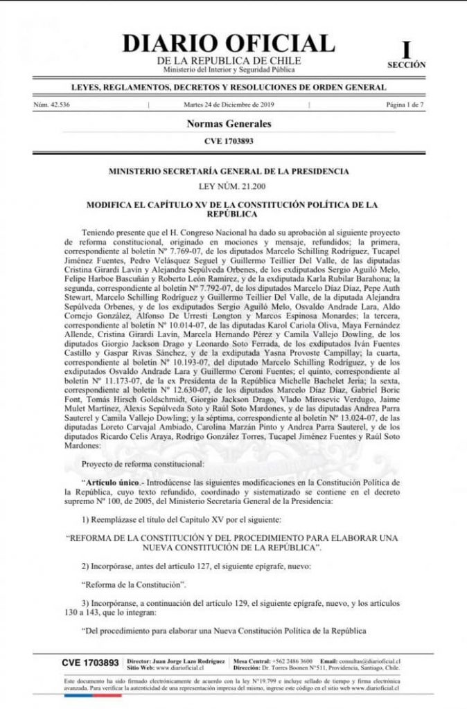 En el Diario Oficial fue publicada este martes la ley que reforma el Capítulo XV de la Constitución Política para elaborar una nueva Carta Fundamental, mediante un plebiscito de entrada.