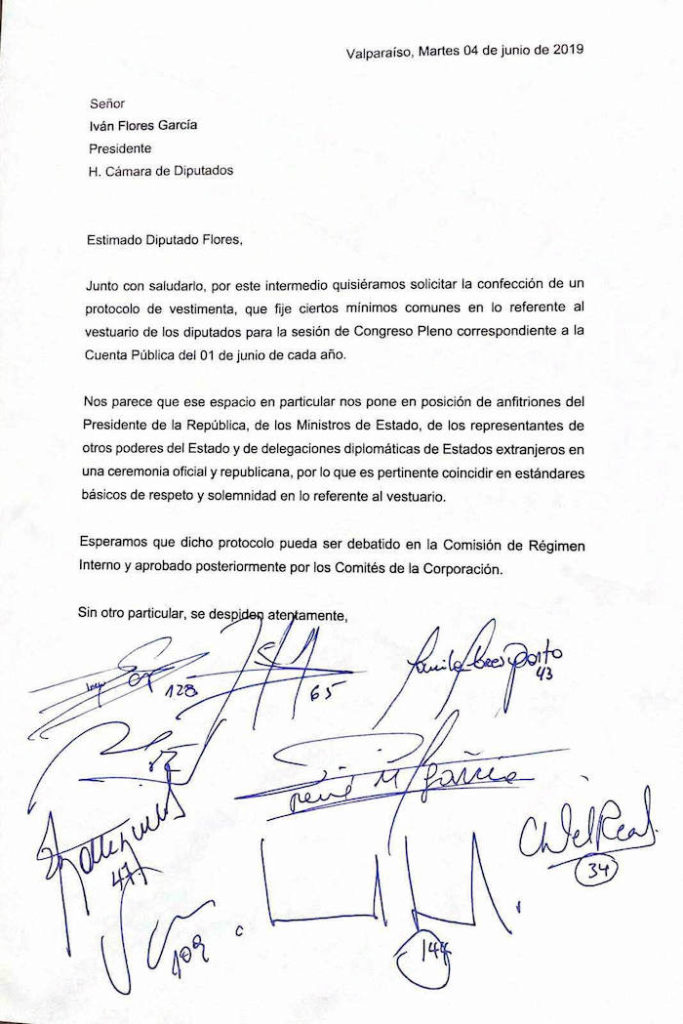 «Nos parece que la actitud de algunos diputados en particular, nos lleva a solicitar que haya un protocolo mínimo de vestuario para los actos oficiales como lo fue la cuenta pública, atendiendo sobre todo a que el 1 de junio es una instancia donde el Congreso hace de anfitrión del Presidente de la República, de embajadores de otros países y junto con eso nos pone de cara a la ciudadanía. Yo creo que eso requiere un cierto nivel de respeto, de solemnidad, por lo tanto me parece que un protocolo mínimo de vestuario es algo en lo cual espero podamos ponernos de acuerdo» Comentó el parlamentario.