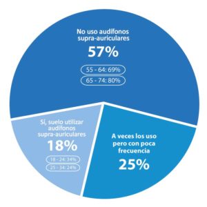 Además el sondeo muestra que solo un 18% de los encuestados usa los auriculares correctos para escuchar música. Para cuidar la audición se deberían usar audífonos supra-auriculares o los que cubren todo el pabellón auditivo.