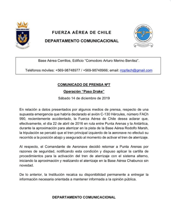 La Fuerza Aérea de Chile (FACH) confirmó que el siniestrado avión Hércules C-130, número 990, había declarado una emergencia en la ruta entre Punta Arenas y la Antártica en 2016.