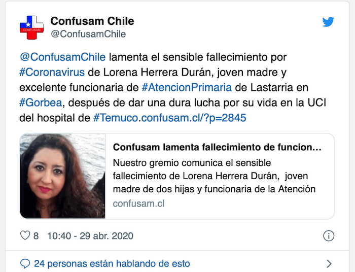 «Quiero expresar mi más sentido pésame a su familia, al Cesfam Lastarria, de la comuna de Gorbea por el fallecimiento de Lorena, funcionaria de la salud», señaló el subsecretario de Redes Asistenciales Arturo Zúñiga.