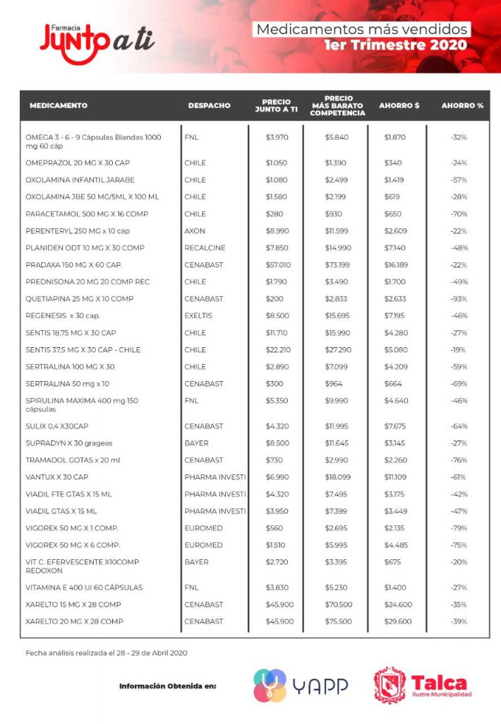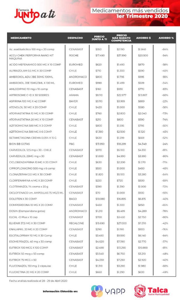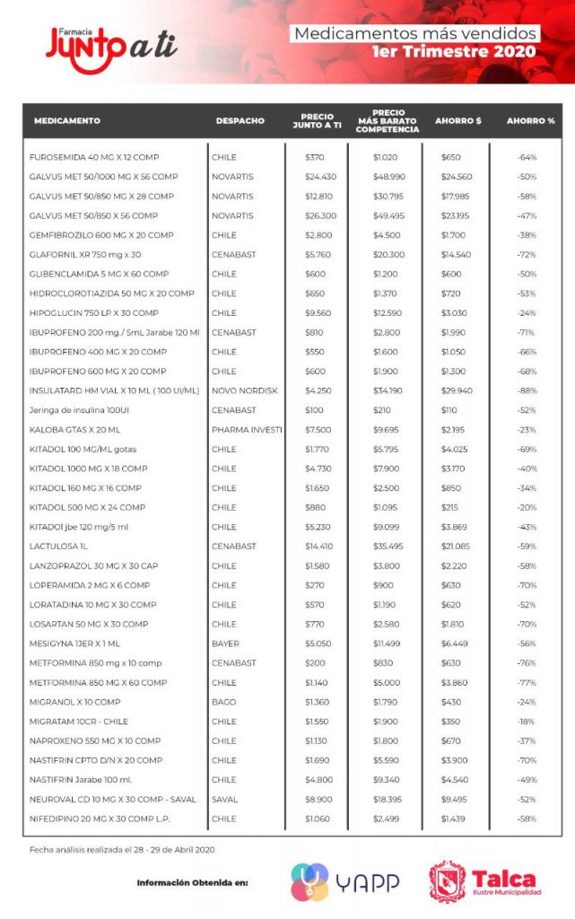 A fines del mes de abril del presente año y con el objetivo de responder al compromiso de buscar y garantizar los precios más bajos en beneficio de la comunidad, la Farmacia “Junto a Ti” realizó un análisis a los 100 medicamentos más vendidos del primer trimestre del año 2020 a través de la información vigente en la aplicación Yapp, que informa los precios de los medicamentos en los puntos de venta más cercanos de la ciudad, pudiendo determinar que el 100% de los medicamentos se puede encontrar de manera más económica en la farmacia municipal tomando en consideración la farmacia con el menor precio informado, contando inclusive con 22 medicamentos con un 70% o más de diferencia y 6 medicamentos con sobre 20 mil pesos de ahorro.