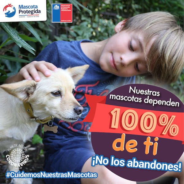 Debido a esto, y con el objetivo de informar a la comunidad sobre la situación del coronavirus y las mascotas, para prevenir el abandono y fomentar el cuidado y protección de los mismos, el Programa Mascota Protegida, perteneciente a la Subsecretaría de Desarrollo Regional, (Subdere), lanzó la campaña #CuidemosNuestrasMascotas, el que además busca reimpulsar la adopción y continuar trabajando de manera conjunta con las organizaciones de protección de mascotas para promover la tenencia responsable.