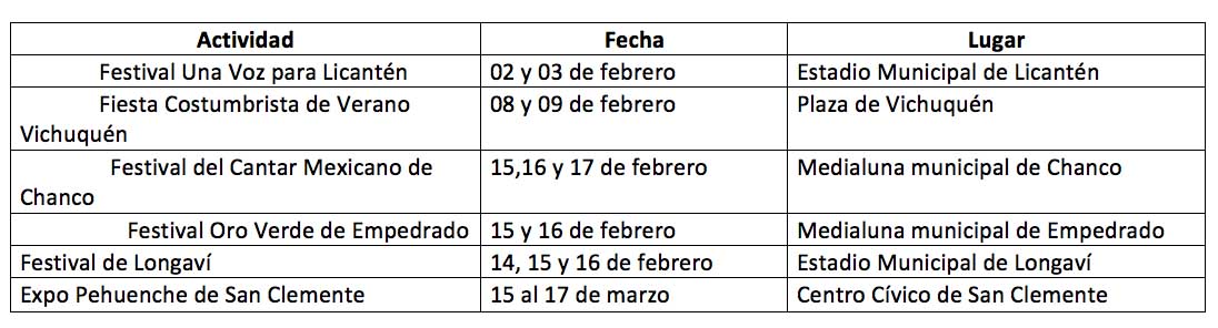 Diversos son los panoramas que se podrán disfrutar en familia en distintas comunas de nuestra región, para los que gustan de la música mexicana, podrán participar de tres noches de fiesta, donde se disfrutará de los mayores exponentes del género mexicano en el país. Por otro lado, se desarrollará el Festival de la voz de Licantén, que tendrá la participación de nuevos artistas.