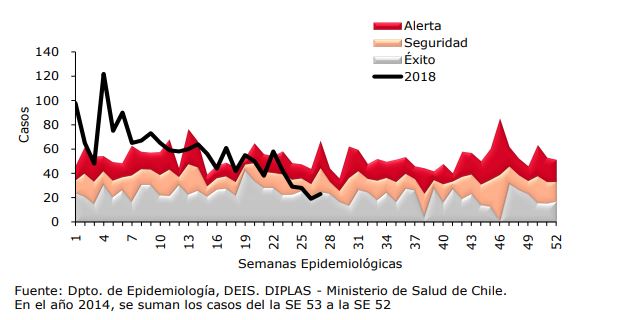 De acuerdo a la autoridad, estas cifras sobrepasan en un 70% a la mediana de casos del quinquenio 2013-2017 (916), donde la mayoría de las semanas los notificados se encuentran dentro o por sobre la zona de alerta, comportamiento que se presenta desde el 2017 producto del aumento sostenido de casos en los últimos tres años.