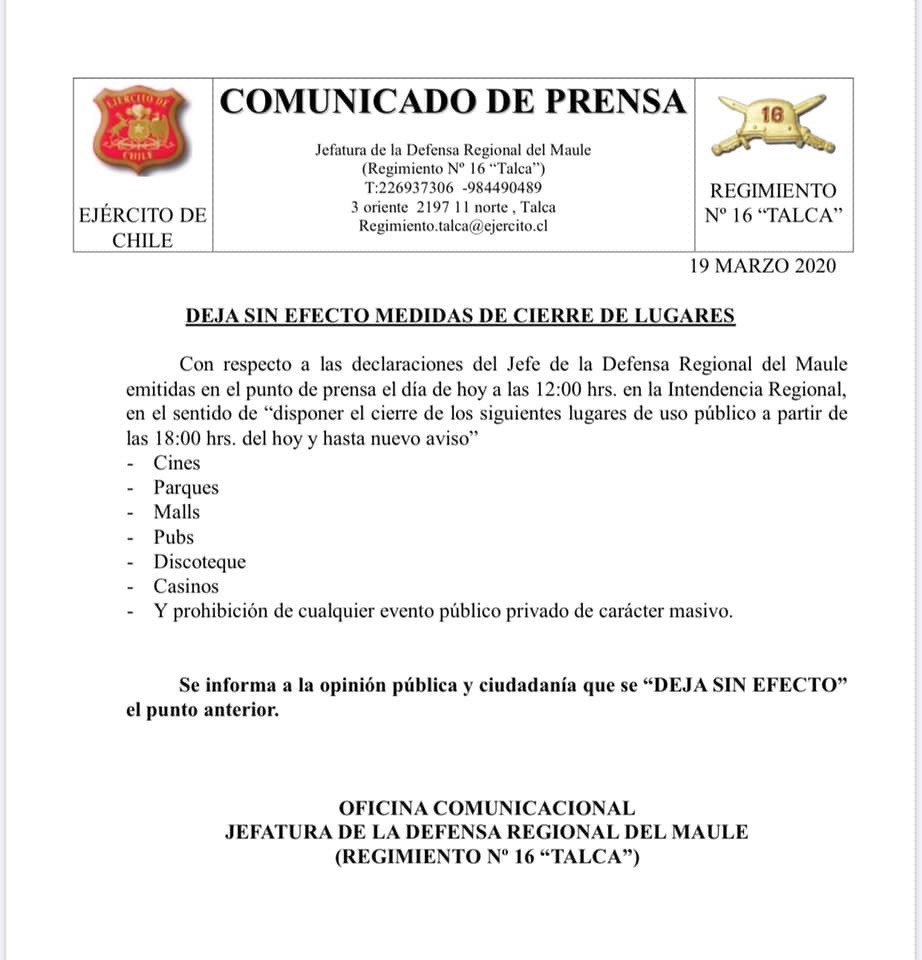 “Se informa a la opinión pública y ciudadanía que se “deja sin efecto” el punto anterior», indicaron desde el Ejército maulino mediante un comunicado de prensa.