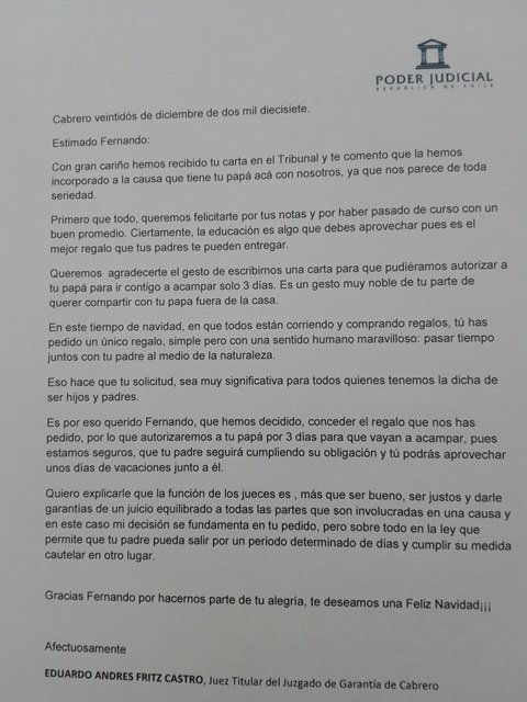 La carta de Fernando se dio a conocer en las redes sociales a través de las cuentas del Poder Judicial, donde se puede leer el texto que envió el niño al juez Eduardo Fritz, pidiendo que su padre lo pudiese acompañar a acampar. Además, ocupó como argumento sus buenas notas y que había pasado de curso.