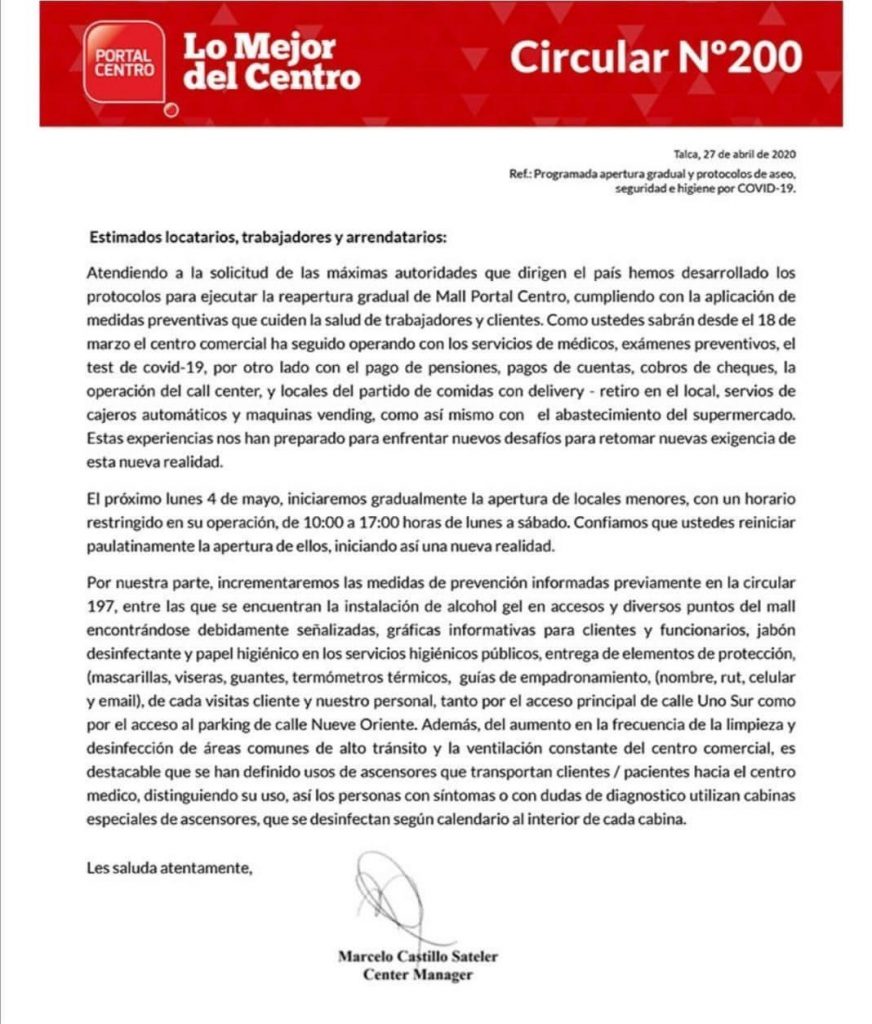 “Hemos desarrollado los protocolos para ejecutar la reapertura del mall, cumpliendo con la aplicación de medidas preventivas que cuiden la salud de trabajadores y clientes”, señala el texto.