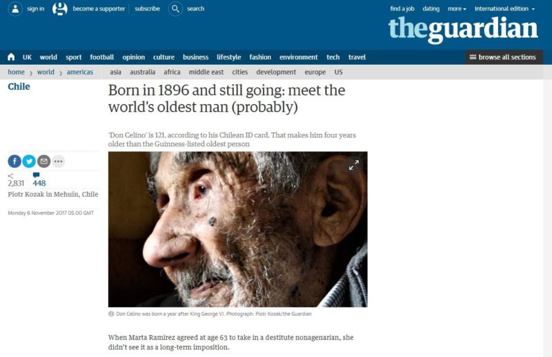 «Nacido en 1896 -un año después de Jorge VI y cuatro años antes de la persona de mayor edad que figura en la lista Guinness, Nabi Tajima-, Villanueva perdió su certificado de nacimiento en el mismo incendio que lo dejó indigente hace 20 años», dice la nota de The Guardian escrita por el periodista Piotr Kozak.