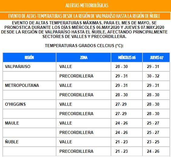 La Dirección Meteorológica de Chile emitió este sábado 2 de mayo una alerta por “altas temperaturas” en cinco regiones de la zona central país.