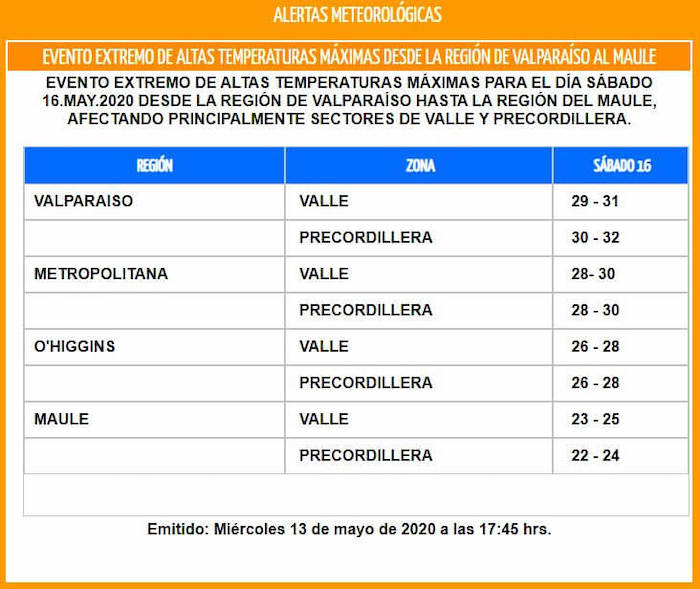 La Dirección Meteorológica de Chile emitió una alerta por un evento de altas temperaturas máximas este sábado 16 de mayo.