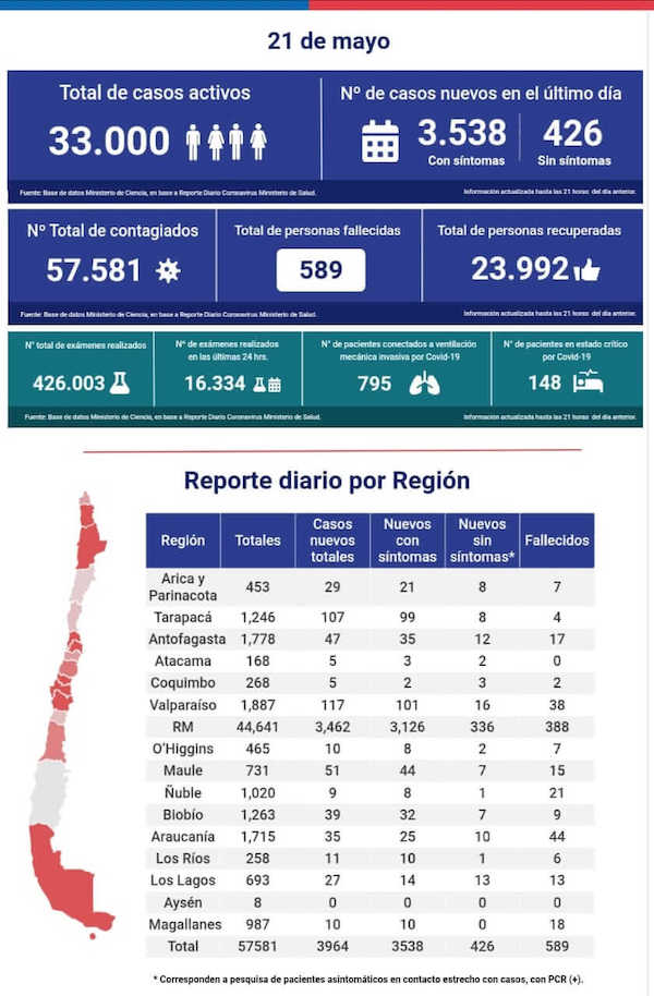 El Ministerio de Salud entregó este jueves 21 de mayo el último balance del impacto del coronavirus Covid-19 en nuestro país.