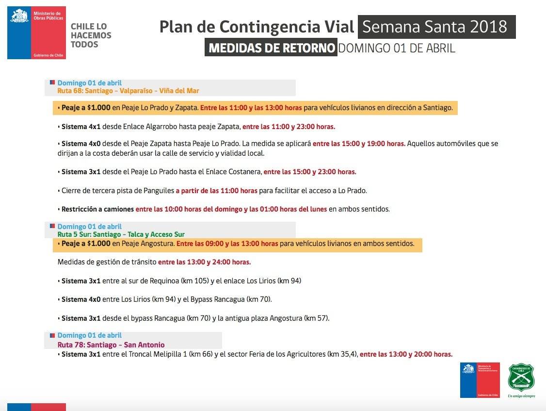 A las 9:00 de la mañana comenzó el peaje a luca para vehículos livianos que pasen en ambos sentidos por el peaje La Angostura de la Ruta 5 y a las 11:00 en los peajes Lo Prado y Zapata de la Ruta 68, en ambas rutas se extenderá hasta las 13:00 horas.