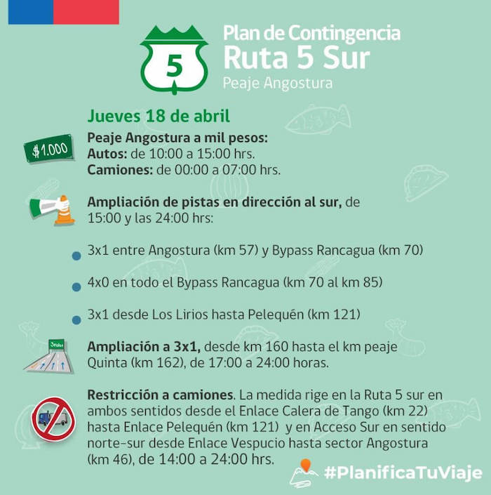 La concesión de la salida sur de la Región Metropolitana tendrá el valor del peaje a mil pesos solo en el Peaje Angostura el jueves 18 de abril, entre las 10 y las 15 horas para los automóviles y las 00 y las 7 horas para camiones.