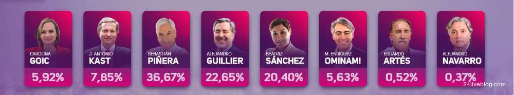Los ocho postulantes a La Moneda, Carolina Goic (DC), José Antonio Kast (IND), Sebastián Piñera (Chile Vamos), Alejandro Guillier (Fuerza de la Mayoría), Beatriz Sánchez (Frente Amplio), Marco Enríquez-Ominami (PRO), Eduardo Artés (UPA) y Alejandro Navarro (País), esperarán por los resultados en sus distintos comandos.