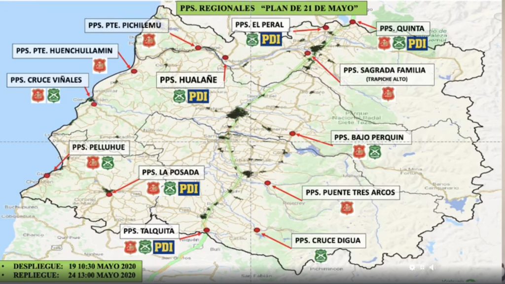 Trece Puntos Preventivos Sanitarios (PPS), a cargo de efectivos del Ejército, Carabineros y PDI, situados en rutas estratégicas de la región, a lo que se suman las más de sesenta barreras sanitarias implementadas por los distintos municipios con personal propio y el apoyo de Carabineros, forman parte del denominado “Plan 21 de Mayo”, con el cual se pretende proteger a la población maulina de visitantes indeseados durante el próximo fin de semana largo, en el marco de la emergencia sanitaria por la pandemia de Covid-19.