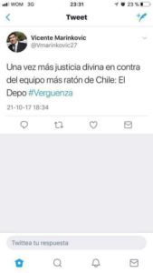 “Una vez más justicia divina en contra del equipo más ratón de Chile: El Depo #Verguenza”, fue lo que escribió en su cuenta Twitter el seremi de Energía de la Región del Maule, Vicente Marinkovic, tras el término del partido que el sábado último disputaron en el estadio “Alcaldesa Esther Roa Rebolledo” de Concepción, los cuadros de Fernández Vial y Deportes Linares, por la vigésimo sexta fecha del campeonato de Tercera División y que terminó con el marcador igualado 1 a 1.