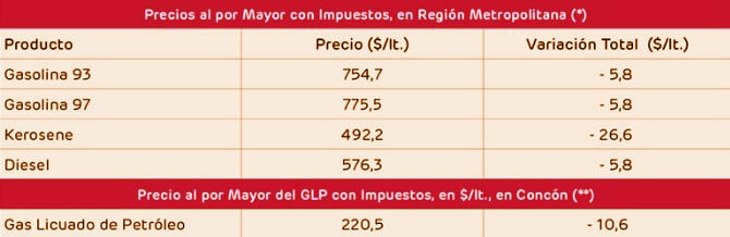 En tanto, la parafina tendrá una gran baja de 26 pesos por litro, mientras que el gas licuado caerá en 10,6 pesos.