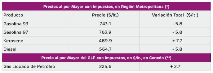 Las gasolinas de 93 y 97 octanos tendrán una disminución de 5,8 pesos por litro en su precio, mientras que el petróleo diesel también experimentará una baja de 5,8 pesos.