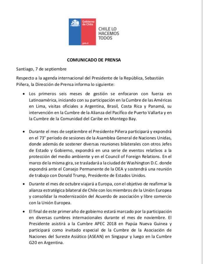 El Mandatario chileno viajará primero a Nueva York para participar de la 73º Asamblea General de las Naciones Unidas, donde además sostendrá reuniones con otros jefes de estado. Posteriormente, irá hasta Washington DC para exponer ante el Consejo Permanente de la OEA.