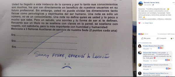 “Recuerda que un título no se sostiene con clavos en la pared. Se sostiene con respeto, con sabiduría, pero lo más importante con humilidad y humanidad: Mencione a tres señoras auxiliares de servicio de nuestra sede”, cierra la solicitud del profesor.