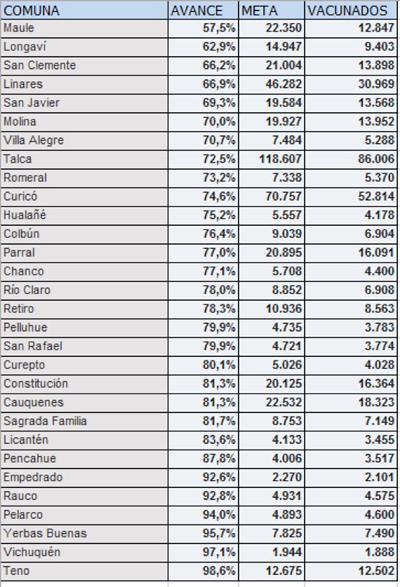 Las comunas que más avance han tenido son Teno (99%), Vichuquén (97%) y Yerbas Buenas (96%), y las que presentan un menor avance son Maule (57%), Longaví (63%) y San Clemente (66%).