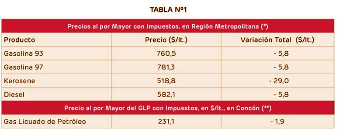 En el caso de la parafina/kerosene, esta tendrá una fuerte disminución en su valor, disminuyendo $29 por litro. En tanto, el Gas Licuado de Petróleo (GLP) bajará en 1,9 pesos.