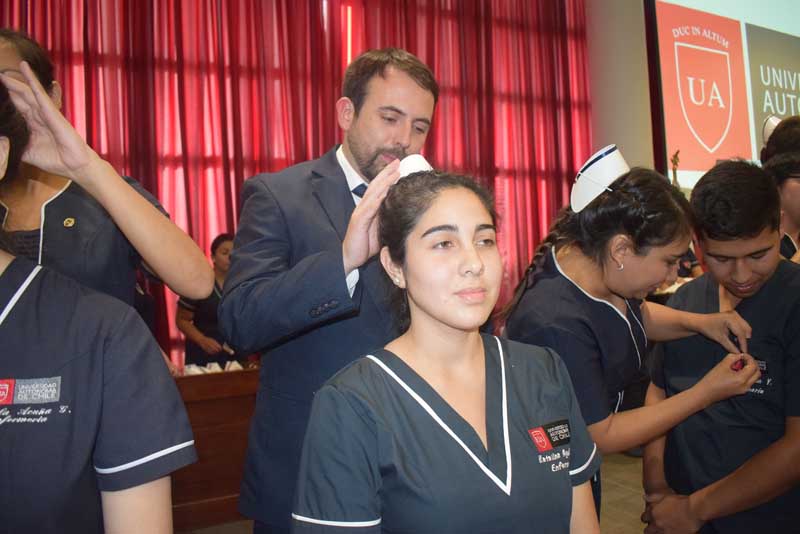 “Esta ceremonia significa dar comienzo a la gestión del cuidado que es el rol profesional. Ellas por primera vez van a entrar a los campos clínicos, van a interactuar con personas que están afectadas por algún problema de salud, que de alguna manera significa dolor. Es complejo estar enfermo, por lo tanto, los estudiantes de enfermería van a prestar un cuidado, pero un cuidado de calidad, que sea seguro y oportuno. Es un gran desafío que desde el mundo de la teoría, pasen a la práctica”, afirmó la directora de carrera, Janet Vargas.