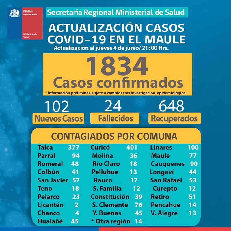 Los nuevos casos fueron registrados en las comunas de Curicó (33), Talca (18), Parral (7), San Clemente (5), Linares (4) , Villa Alegre (4), Rauco (4), Maule (4), Molina (4), Cauquenes (3), San Javier (2), Hualañé (2), San Rafael (2), Retiro (2), Sagrada Familia (2), Río Claro (1), Colbún (1), Pelluhue (1), Pelarco (1), Valparaíso (1), y Cerrillos (1).