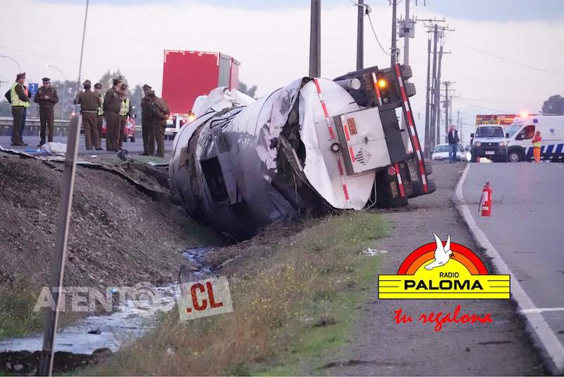 La Central de Prensa de Paloma y su medio asociado Atentos.cl informan del volcamiento de camión con material peligroso en el kilómetro 257 que mantiene la Ruta 5 sur cortada. Equipos de emergencia trabajan en el lugar.